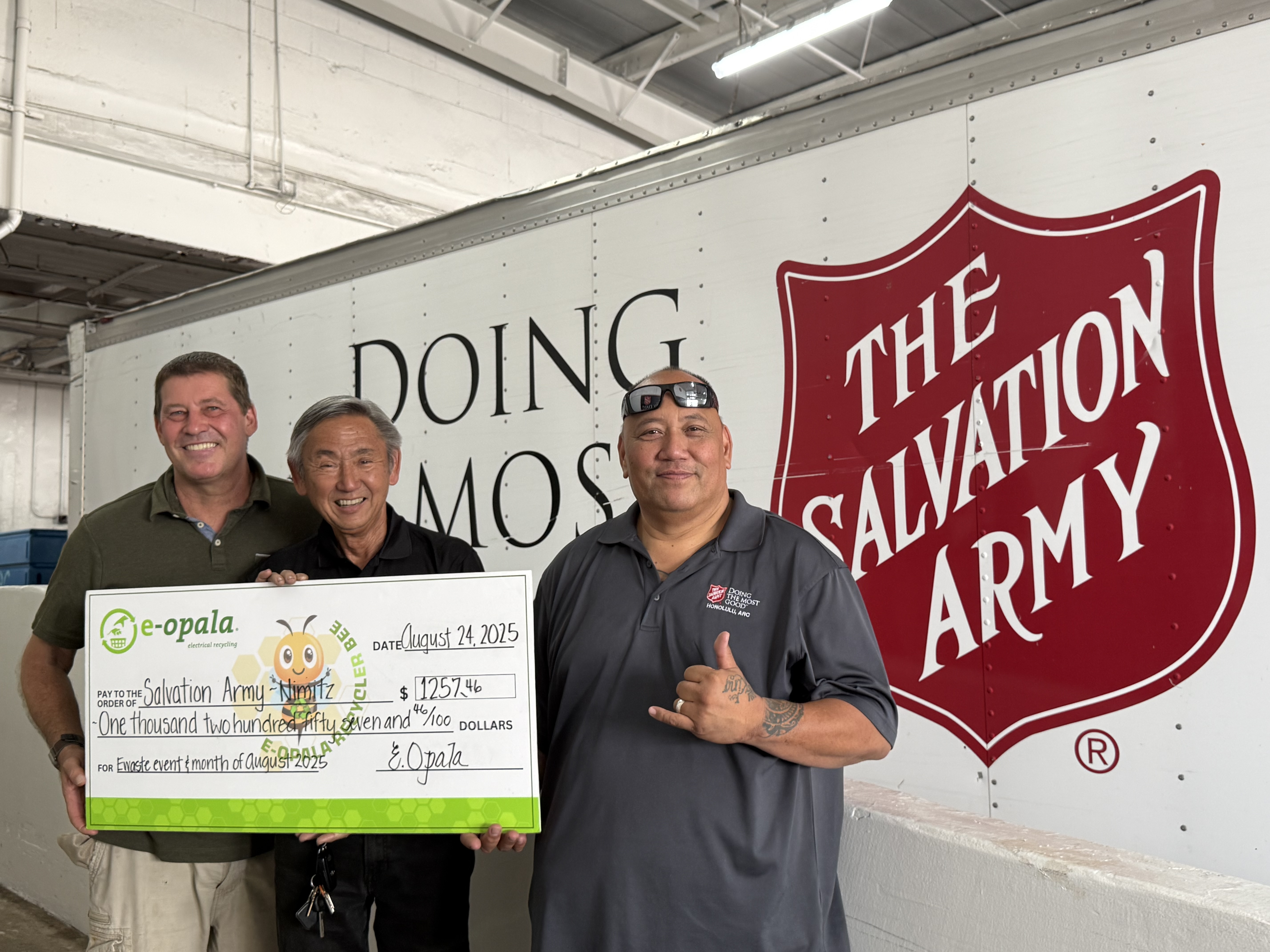 we were excited and happy to donate over $1200 to the Salvation Army to help with their outreach programs, all funds or collected from our E-waste program and continued to Salvation Army by E-Opala